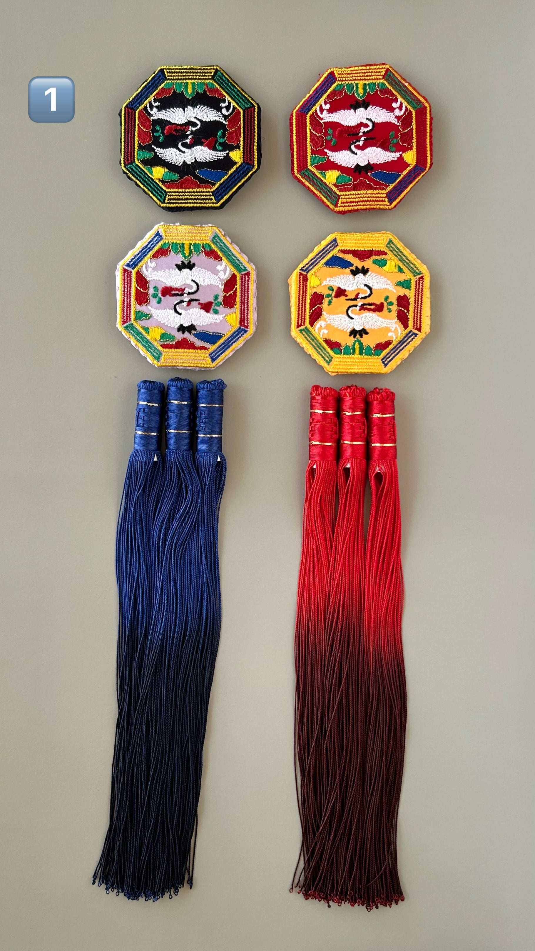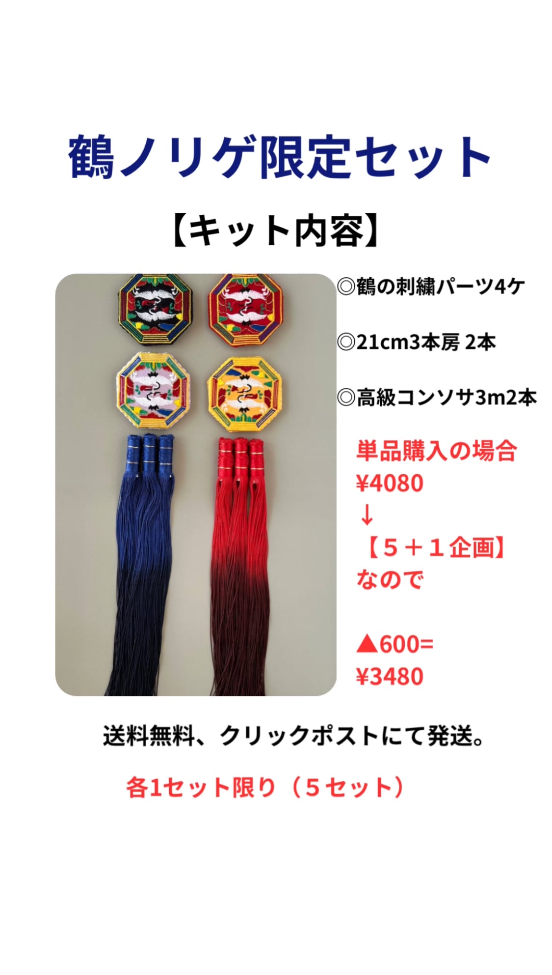長寿と幸せを願う 【鶴のノリゲセット】1️⃣ ◎鶴の刺繍パーツ4ケ ◎21CM3本房 2本 ◎高級コンソサ3M2本 韓国ノリゲ制作にご利用ください