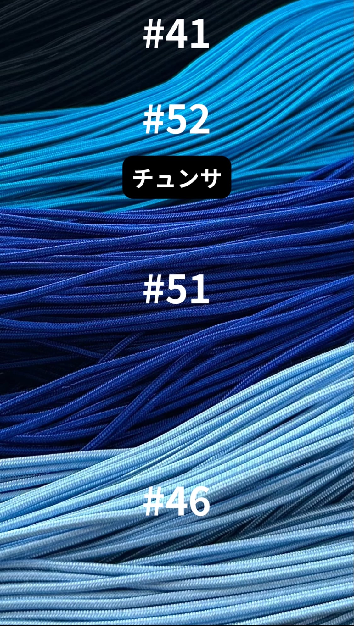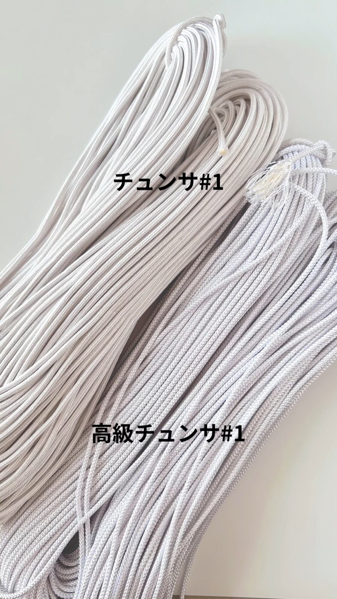❋コンソサをご覧いただきますとお解りのように、艶感はほぼ同じで、ザラつき感も同じ、若干高級コンソサが太く、コンソサより固いので、ノリゲなどの長い物を結ぶ時や、複雑な結びをする時には高級コンソサをご利用された方がよろしいかなと思います。